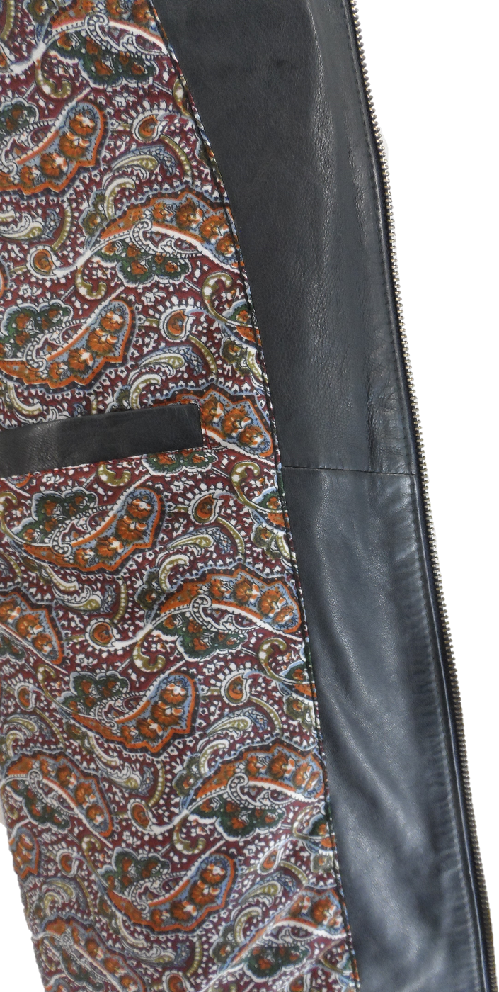 The unforgettable look in the classic film Le Mans, The Gabicci McQueen men's leather jacket is a must-have for any man looking for a wearable modern biker-style jacket. Based on the Classic Racing Style made famous by McQueen Himself with Two Side, One Internal Pocket Finished inside with A paisley Print,Color-coordinated racing stripes and a buttoned collar finish off this iconic staple of the 60s and 70s. Heritage never really dies.