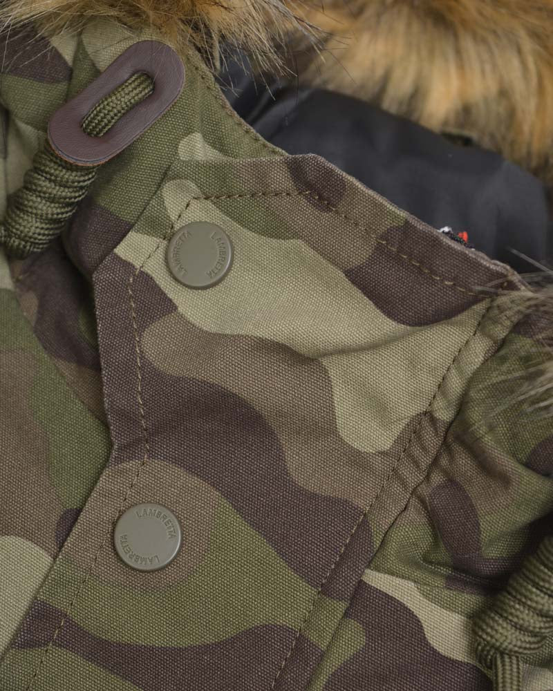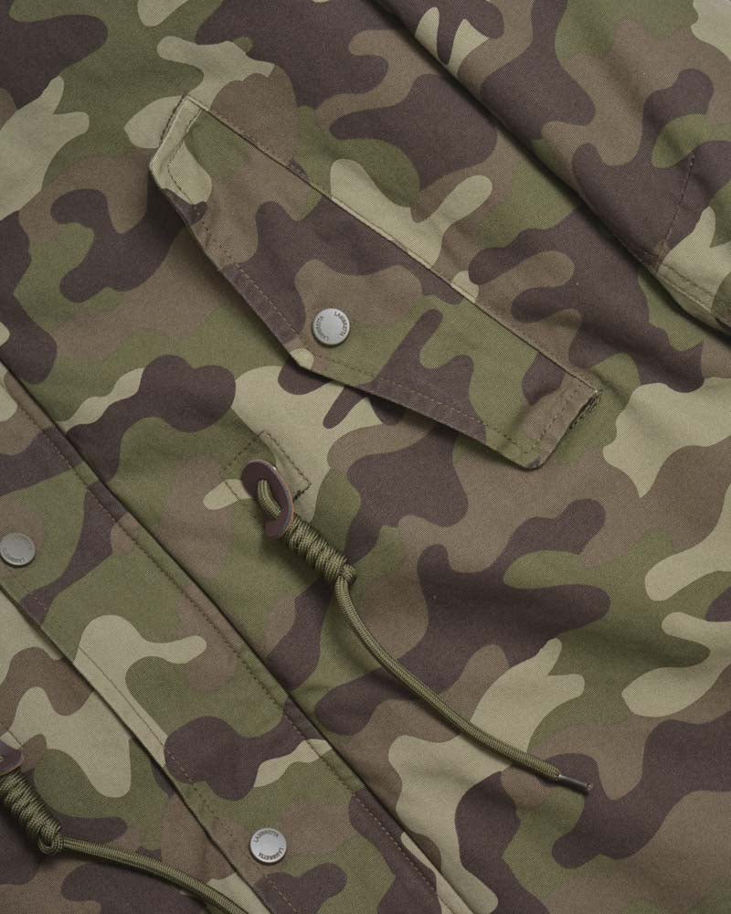 A 4 pocket design with 2 at the waist and 2 at the chest all Sleeve badges are present on this model with the addition of an embroidered logo to the chest and a woven label to the bottom right-hand pocket, a drawstring is also fitted to the waist area. Zip fastening with a popper button over flap. A great looking winter parka