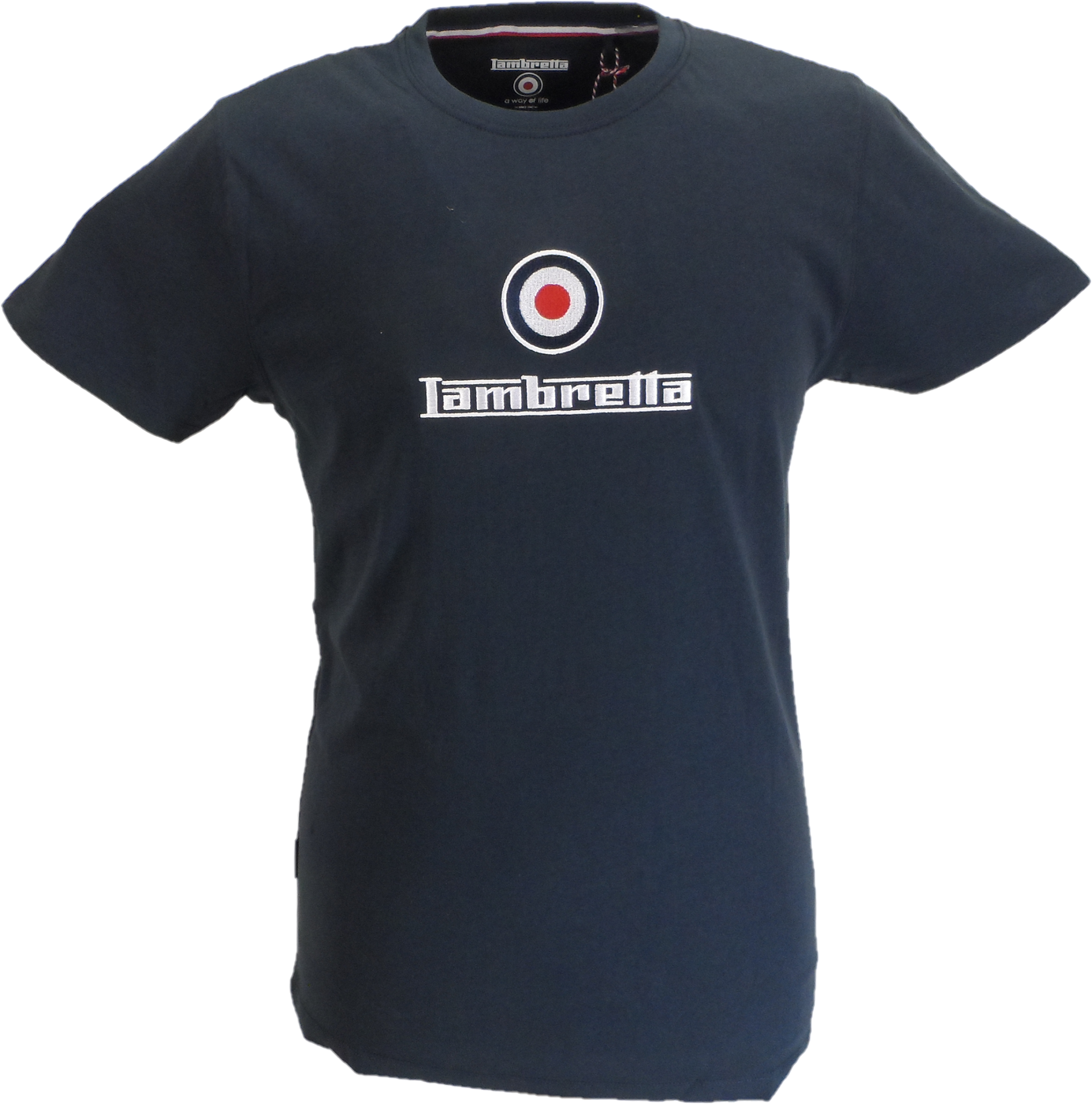 The Lambretta Men's Retro T-Shirt features an embroidered design, with both the target and Lambretta logos meticulously stitched for a premium look, not merely printed.