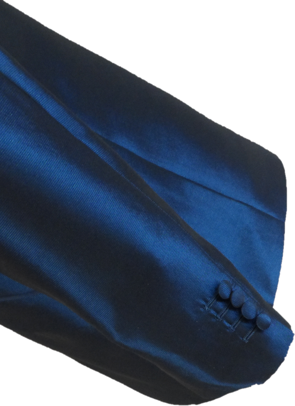 This Tonic Blue with Black Sheen suit features a classic retro design with a fastening of 3 covered buttons, 3 pockets and a top breast pocket, and a 4 button effect cuff., a two-finger width collar, and a paisley lining for added style. The suit is completed with a single vent for comfortable wear.