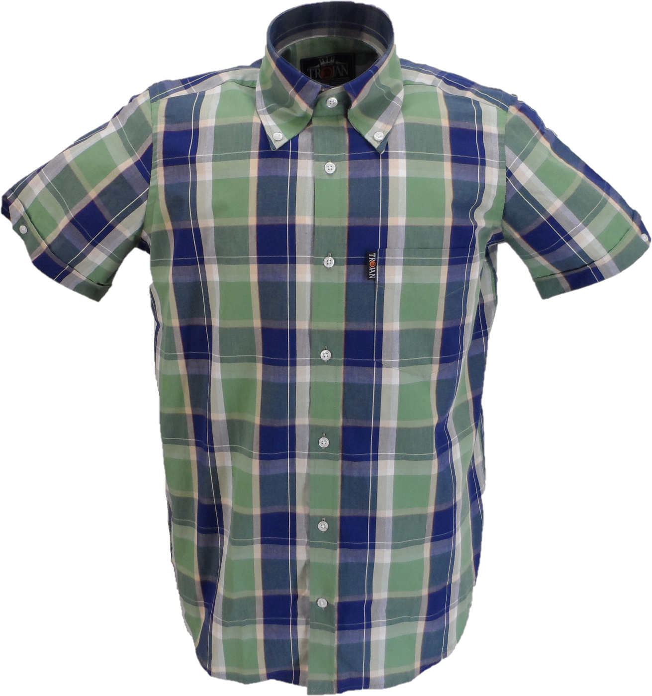 Pure Cotton Tartan check button-down shirt, with 3-finger, roll button-down collar, chest pocket (with ‘Trojan’ tab label), short sleeve with v-insert/double button detail, back collar with button/tab detail and full length back placket with a loop.